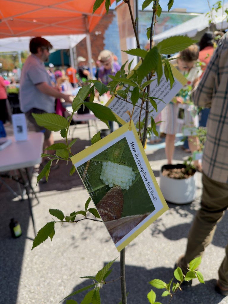 Many Maryland native caterpillars rely on Maryland native trees for food. The questions and answers in the FONTT display aim to help people understand why this matters by explaining about caterpillars and food webs.