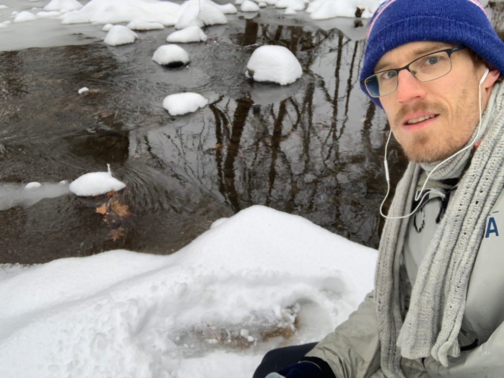 I clamber down the steep bank, then frog leap from rock to rock to get to the center of the stream where I take a sample. The water is frigid; the yellow sun low behind bare, black trees. Sample in hand, I take an impromptu hike through the small woods bordering Takoma Branch.