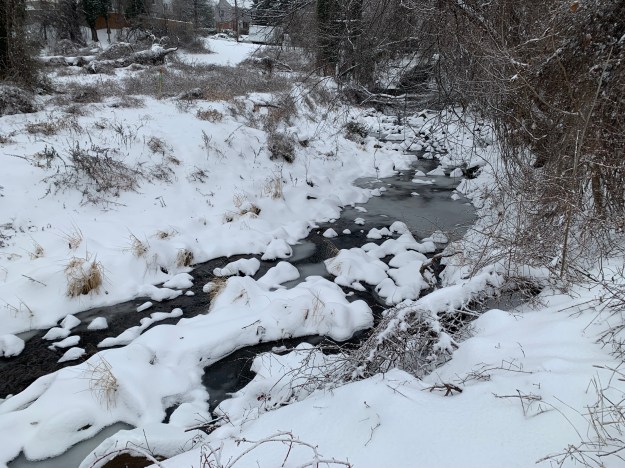 Today’s readings will show a slight downturn from yesterday’s peak level here at Takoma Branch, where cardinals flit about searching for food, deer eye me warily from icy thickets, and the waters continue to flow.